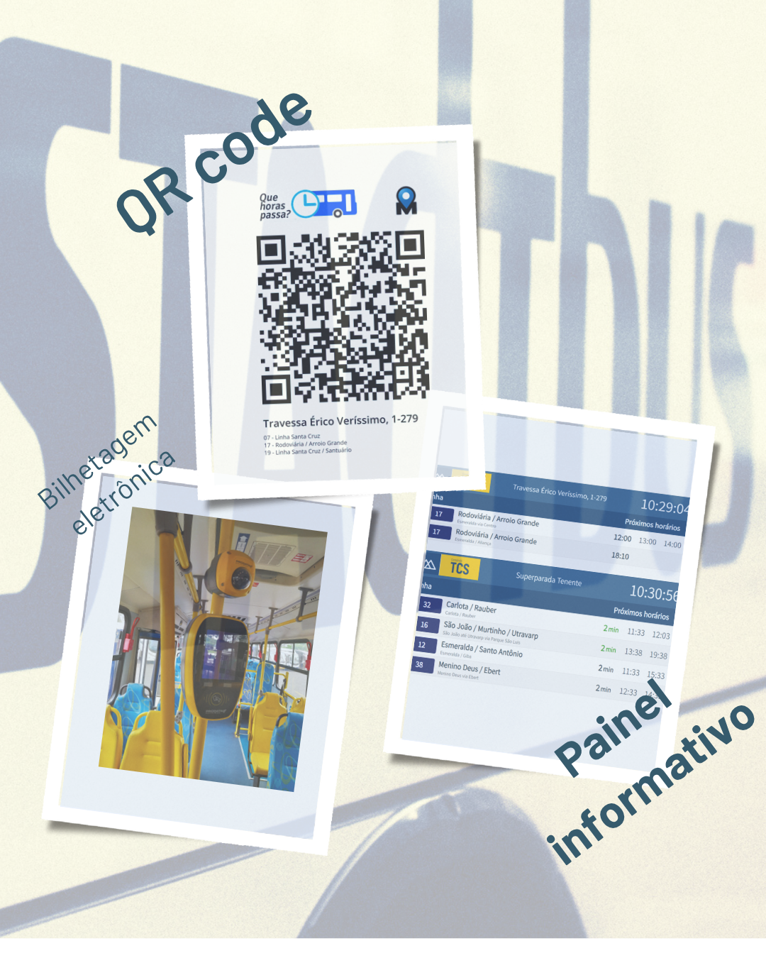 QR code – Disponível aos usuários em pontos estratégicos, os códigos de acesso rápido, permitem em segundos, baixar e acessar todas as informações necessárias (Horários e Itinerários) para o usuário chegar ao seu destino de forma segura e tranquila.